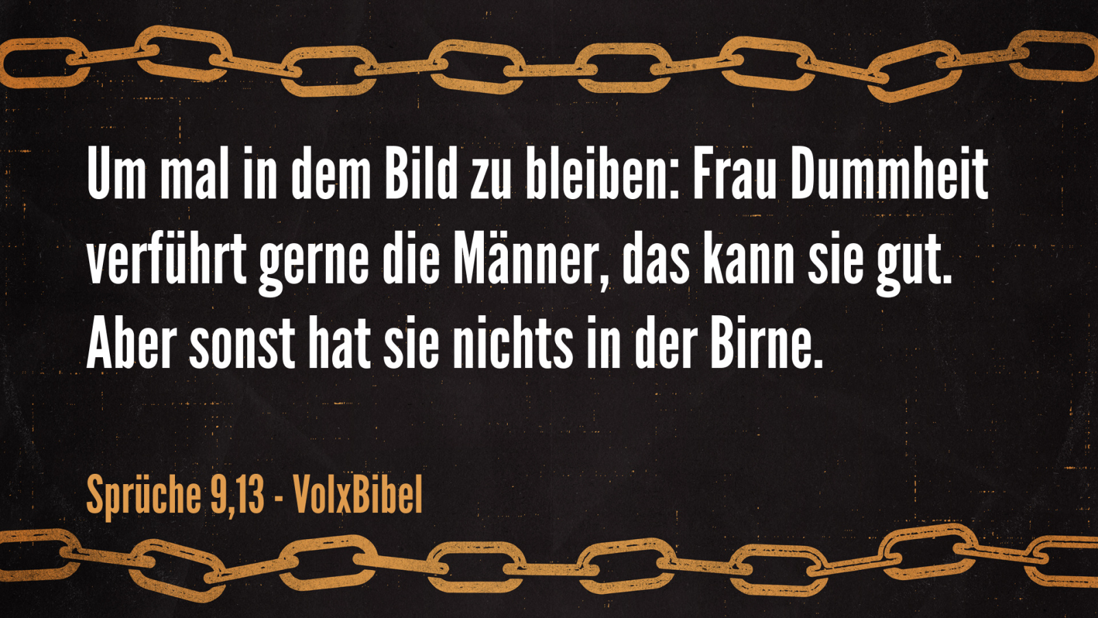 »Die Frau der Torheit«, kǝsîlût, die Verkörperung der Torheit, entspricht der »fremden Frau« (2,16), und sie ist »laut« oder »lärmend«, hômijjâh, wie in 7,11 von der Ehebrecherin gesagt wird.