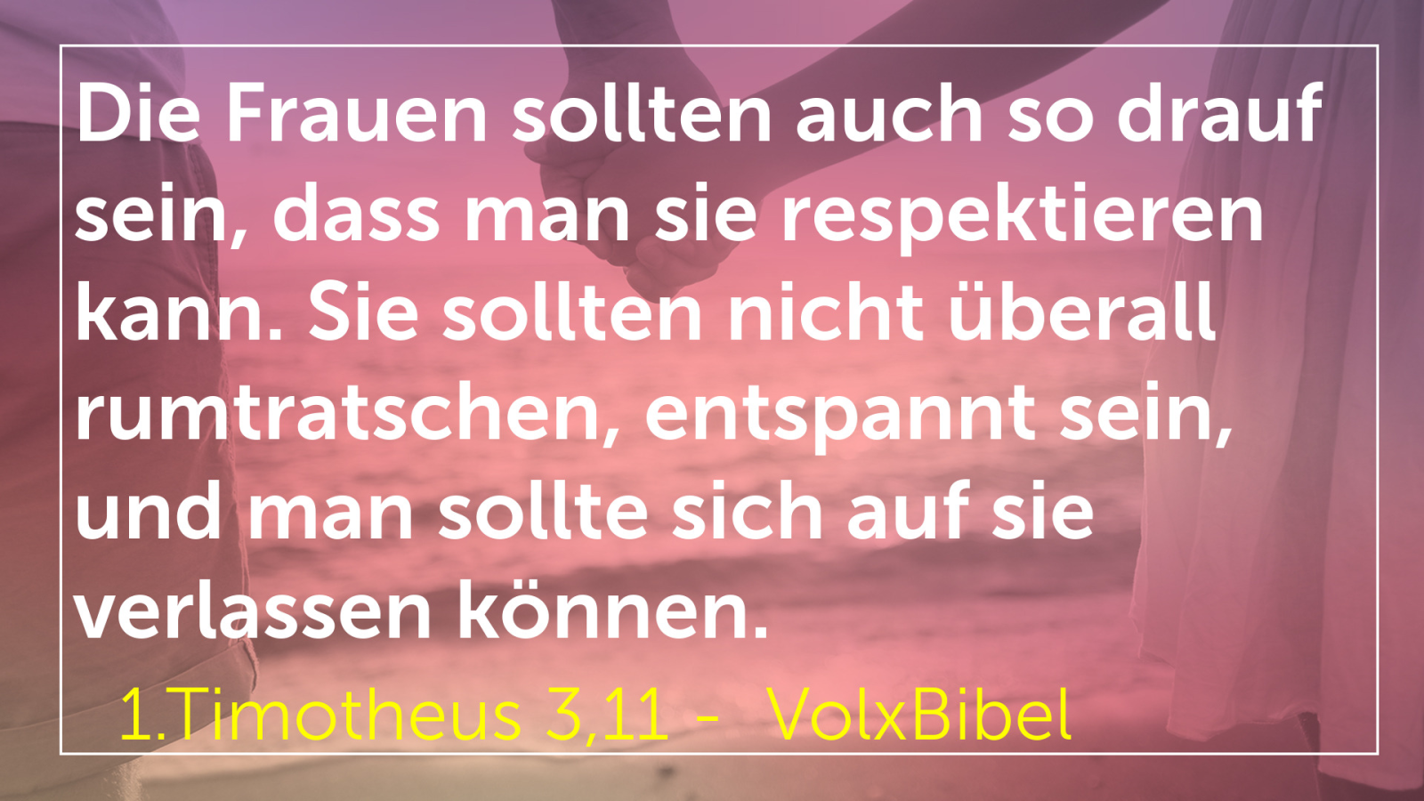 Auch die Frauen sollen sich so verhalten, dass sie respektiert werden und nicht durch ihr Reden Menschen durcheinanderbringen. Sie sollen besonnen und in allen Angelegenheiten zuverlässig sein.