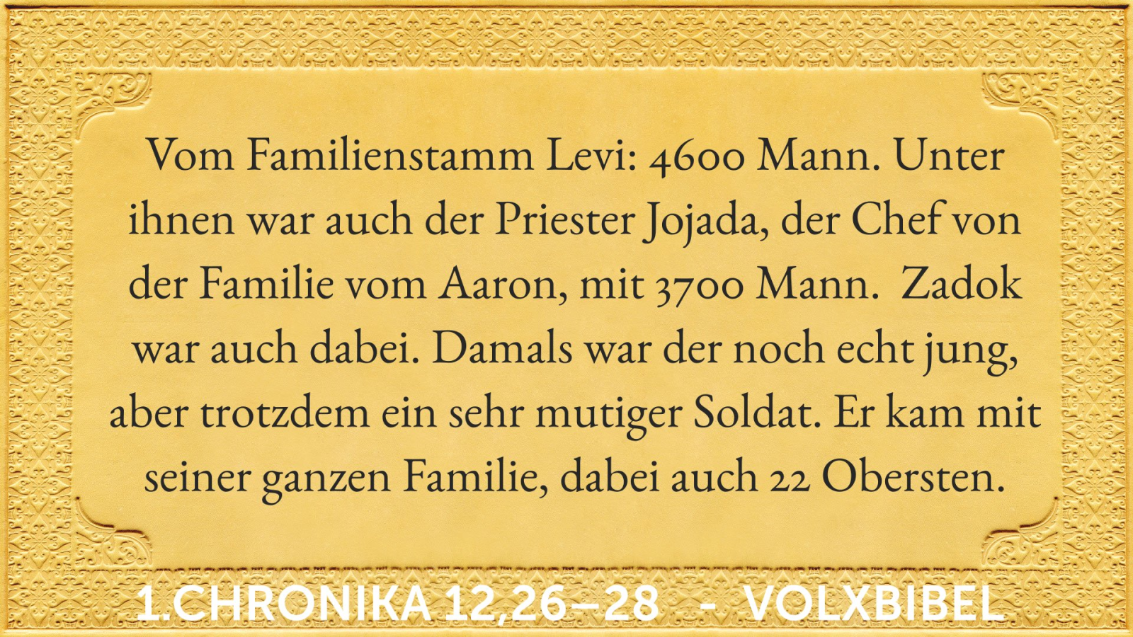 Von den Söhnen der Leviten viertausendsechshundert. Und Jehojada war der Führer [der Söhne] Aarons, und mit ihm waren dreitausendsiebenhundert. Auch Zadok, ein junger Mann, stark und tapfer, und das Haus seiner Vorväter, zweiundzwanzig Oberste.