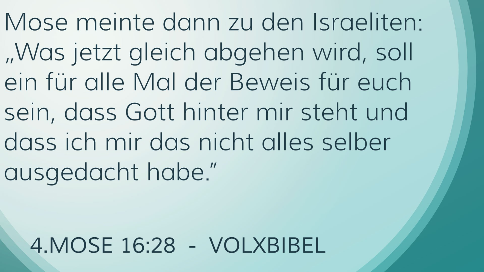 Könnte es also passieren, dass wir heute Menschen folgen, die wie Korah sind, und sich „neben“ Christus als Führer der Gemeinde aufstellen wollen? Die Geschichte, wie Korah und „seine Anhänger“ enden, zeigt, wie Jehovah über Menschen denkt, die „SEINEN Führer“ ersetzten wollen. Sei also „sehr vorsichtig“ wen du als den „größeren Mose“ folgst!