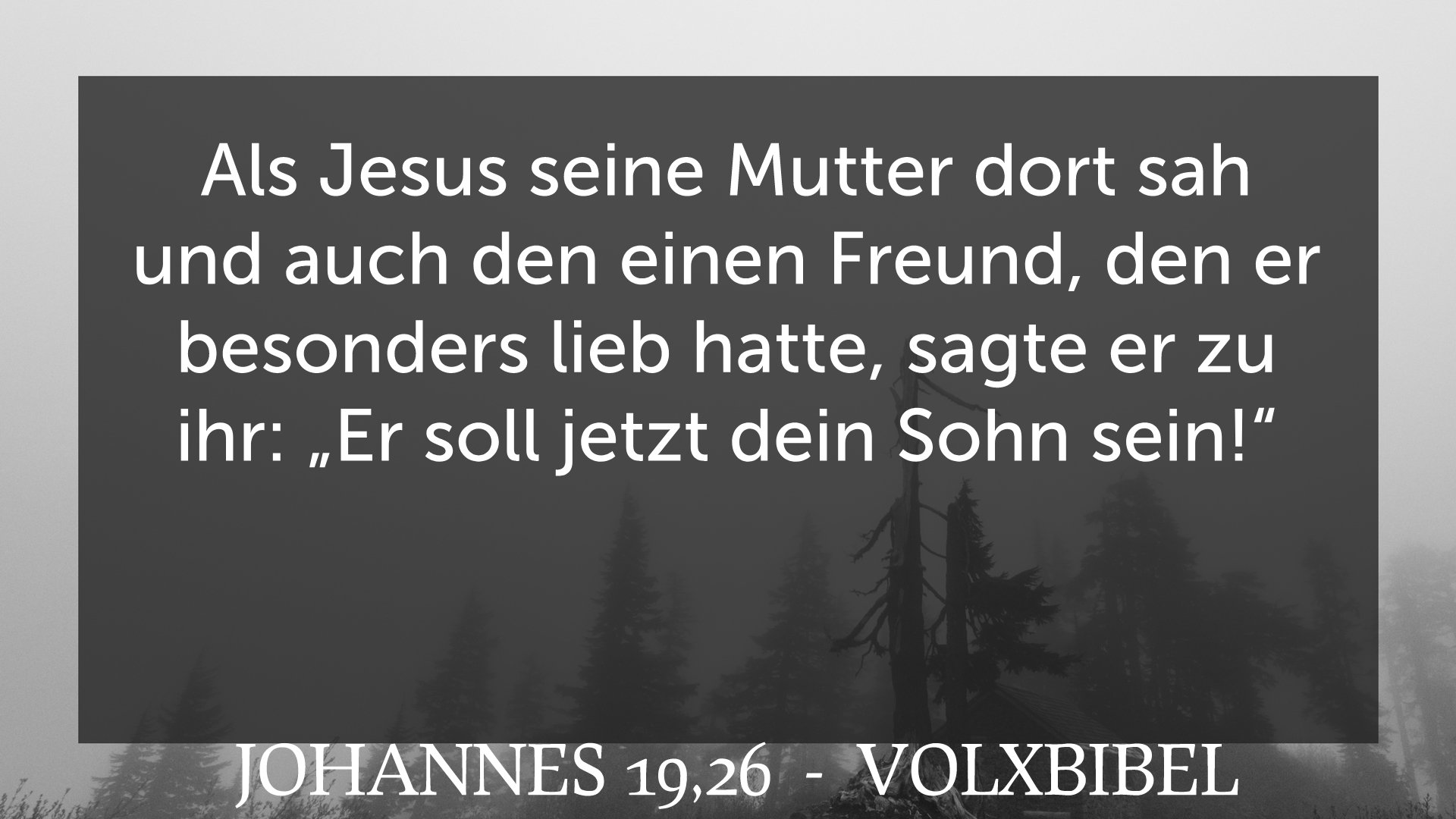 Als nun Jesus die Mutter sah und den Jünger, welchen er liebte, dabeistehen, spricht er zu seiner Mutter: Weib, siehe, dein Sohn!