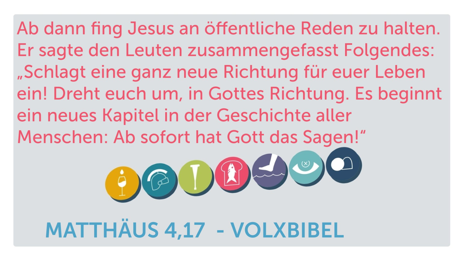 Von da an begann Jesus zu predigen: «Ändert euch von Grund auf! Kehrt um zu Gott! Denn die Herrschaft Gottes bricht jetzt an!»