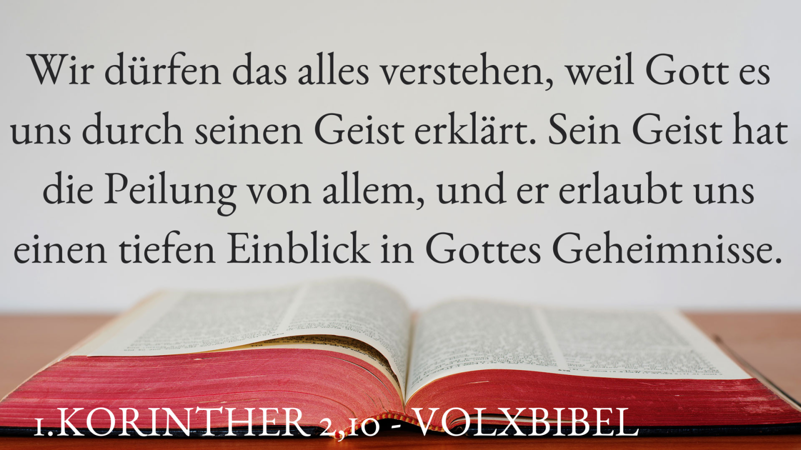 Uns aber hat Gott dieses Geheimnis durch seinen Geist enthüllt – durch den Geist, der alles erforscht, auch die verborgensten Gedanken Gottes.