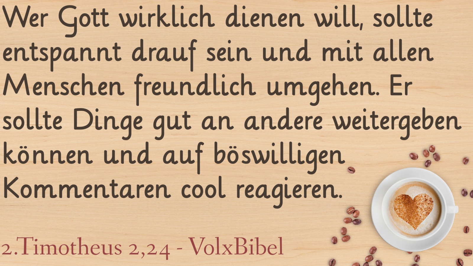 Ein Sklave des Herrn hat es aber nicht nötig zu streiten, sondern muss zu allen sanft sein, er muss lehrfähig sein, sich beherrschen, wenn ihm Unrecht geschieht,