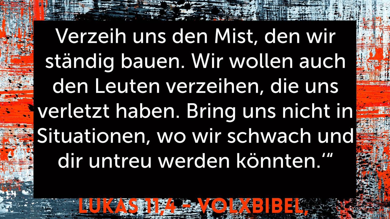 Und vergib uns unsere Sünden, denn auch wir vergeben allen, die an uns schuldig sind. Und führe uns nicht in Versuchung, sondern erlöse uns vom Bösen.‘ “