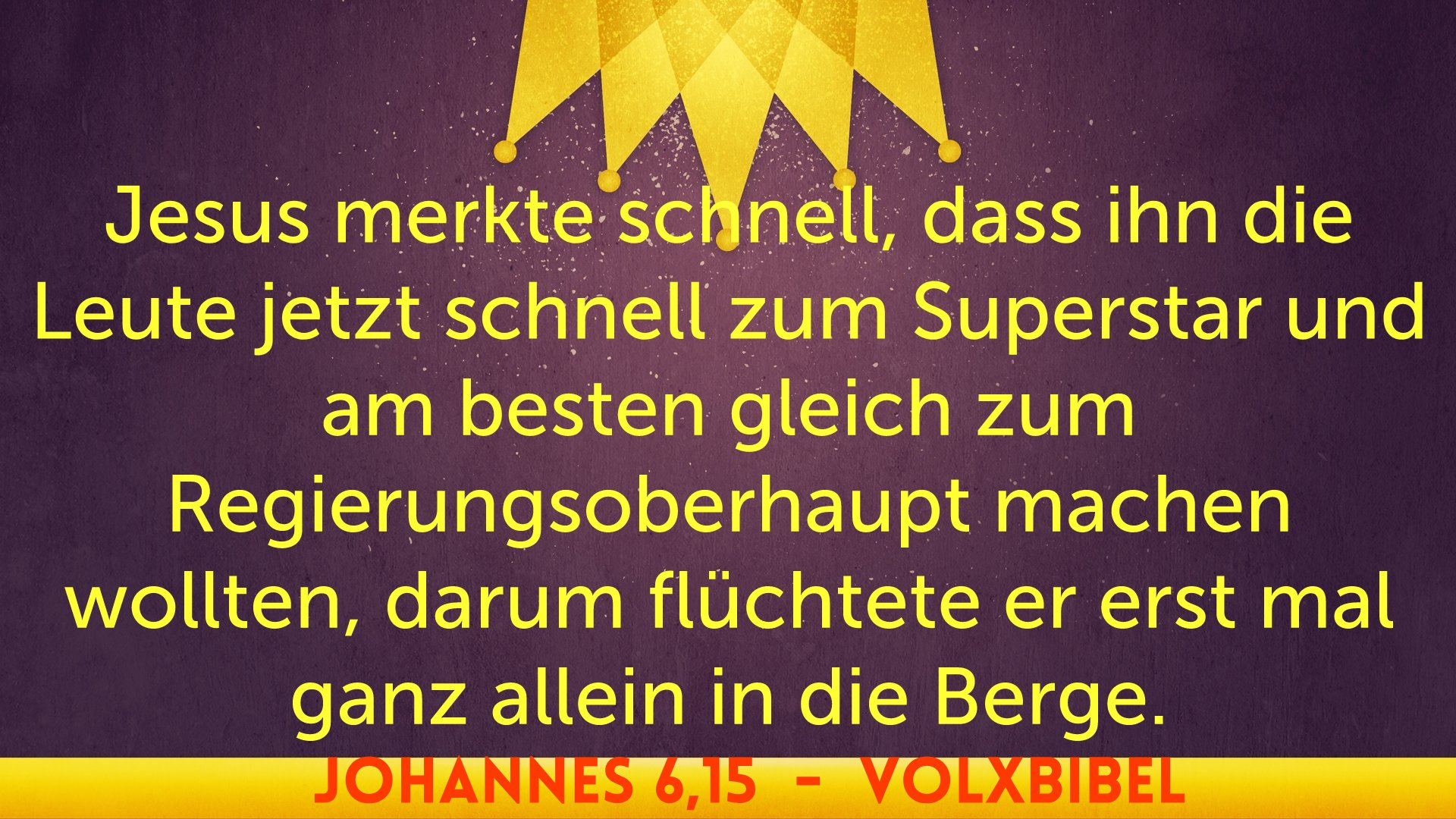 Jesus spürt, was hier im Gange ist. Läßt er es geschehen? „Da Jesus nun merkte, daß sie kommen wollten und sich seiner bemächtigen, um ihn zum König zu machen, zog er sich wieder in das Gebirge zurück, er allein.“