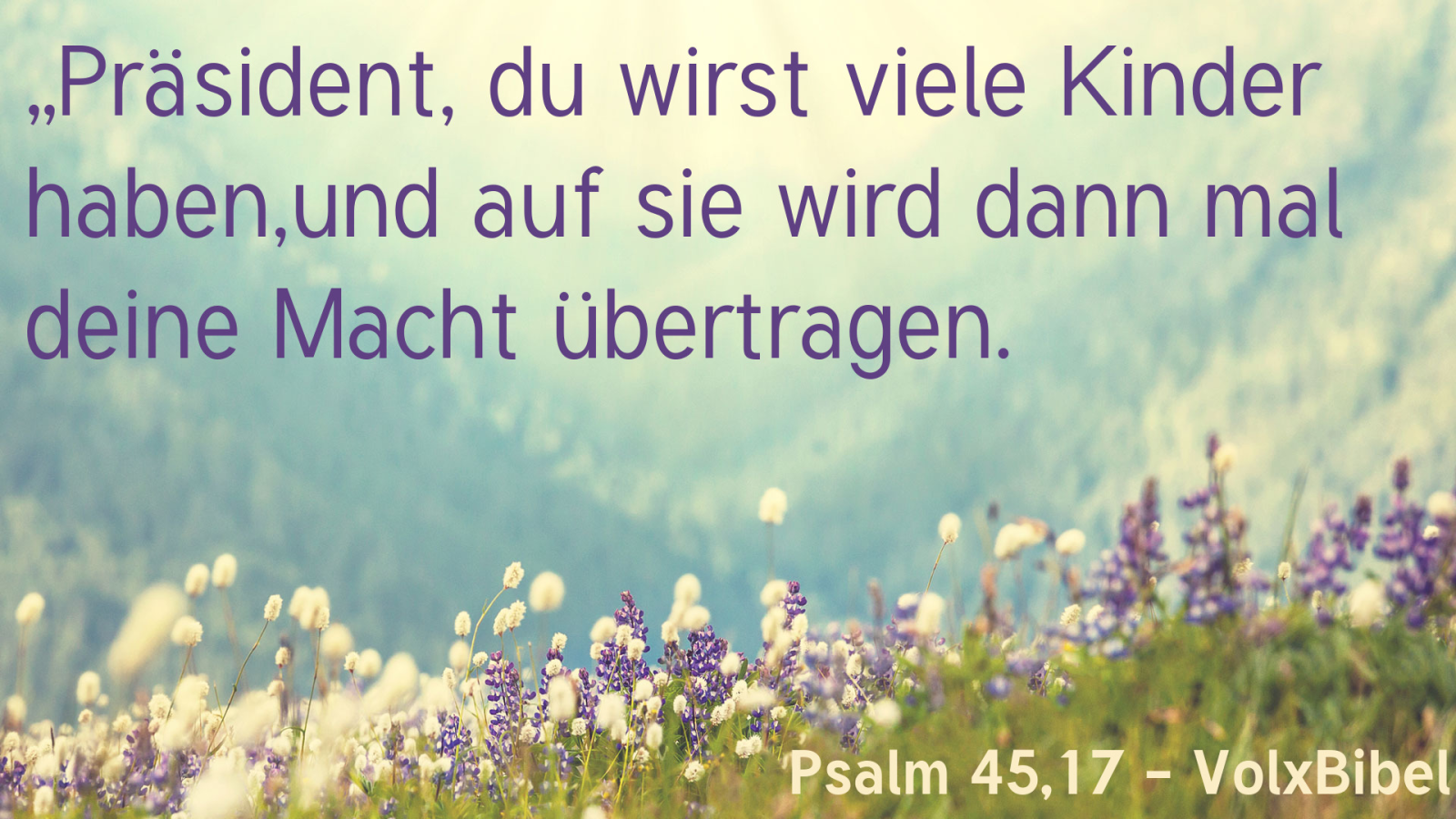 Diese prophetische Poesie gipfelt in einem bemerkenswerten Höhepunkt. An Stelle deiner Väter werden deine Söhne sein. Wer wird hier angeredet? Obwohl im Blick auf V. 11 die »Braut« gemeint sein wird, zeigt die Fortsetzung: du setzt sie als Fürsten ein auf der ganzen Erde, daß hier nur ein gesalbter Davidide gemeint sein kann; denn nur er kann Fürsten oder Verwalter einsetzen. » (Der Dichter) sagt nicht, daß (die Söhne) einst den König beerben sollen; denn es wäre nach höfischem Geschmack sehr unzart, an solchem Festtage an Tod und Erbschaft zu denken. Sondern mit seinem Ausdruck wünscht er, seine Söhne möchten einst an seiner Väter Stelle treten und ›alle Welt‹ mit ihm regieren!« (Gunkel). Auf typisch alttestamentliche Weise wird also die ewige Dauer des Messiasseins durch die ununterbrochene Nachfolge der Davidssöhne angesagt, ganz im Sinne von 2Sam 7. Damit liegt der Akzent nicht auf den Söhnen, sondern auf ihm, dem von Gott Gesalbten. So heißt es im letzten Satz: Ich will deinen Namen ins Gedächtnis rufen von Geschlecht zu Geschlecht. Der König der Herrlichkeit, dem alle Herrlichkeit der Welt durch die »Braut« zugeführt wird, wird einmal der Zielpunkt der Anbetung durch die Völker sein, denn es heißt: darum werden die Völker dich preisen für immer und ewig.